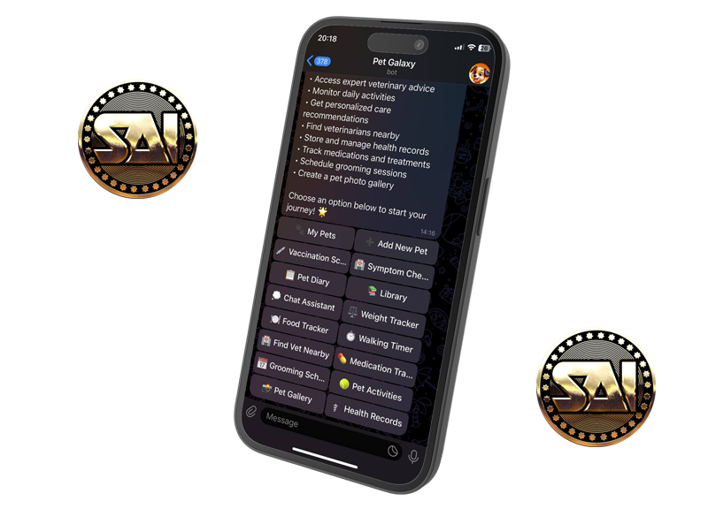 Everything you need for your pet's well-being in one Telegram app: health tracking, expert care, records management, and blockchain features. Our goal - to be your complete pet care assistant